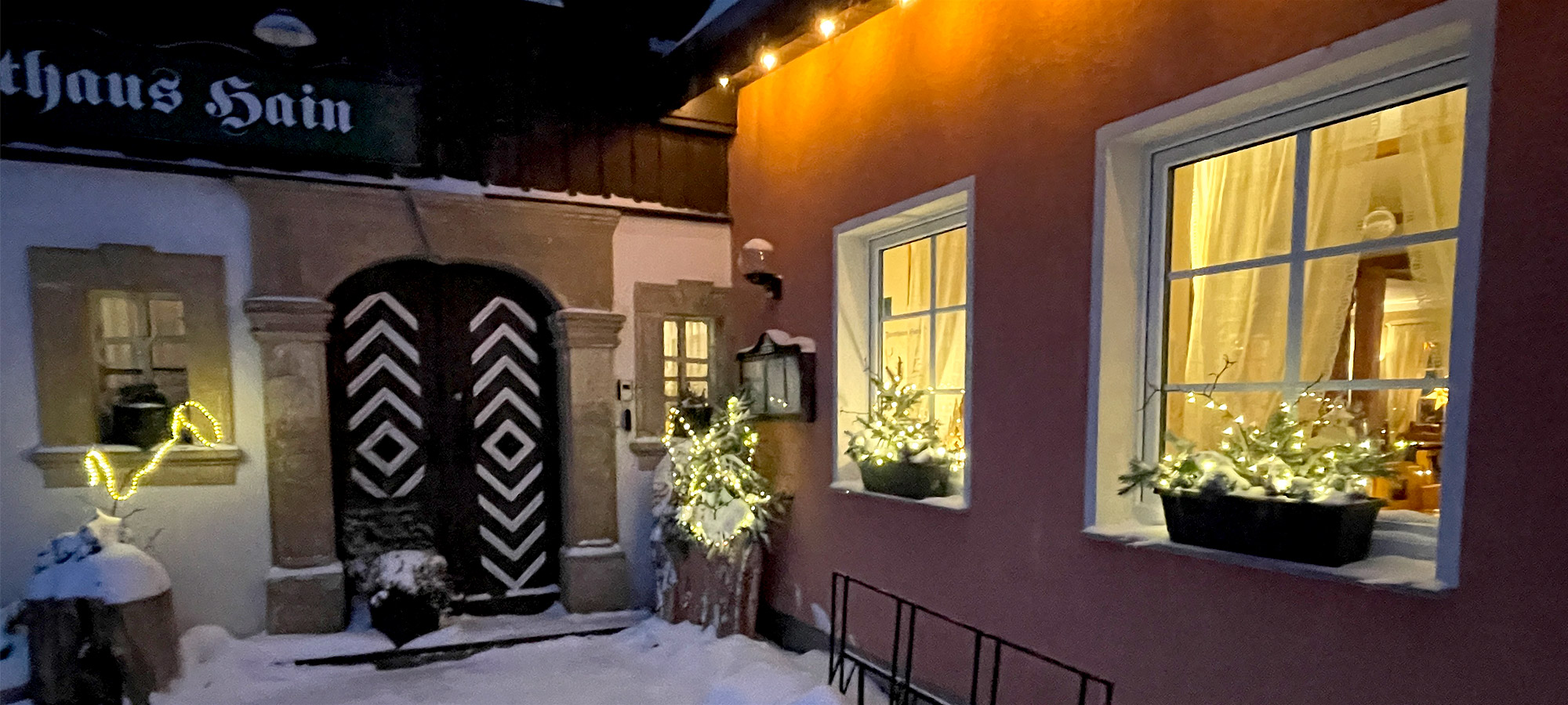 Wenn Sie bei uns zu Gast sind, schlafen Sie vielleicht nicht wie im Paradies, aber direkt daneben. Denn wo sich auch Fuchs und Hase gute Nacht sagen, ist es himmlisch still. Fernab von Straßenlärm und Alltagshektik bietet unser Gasthaus am Randes des Dörfchens Hain und direkt am Wald die idealen Voraussetzungen, um mal so richtig zur Ruhe zu kommen. Übrigens sind bei uns auch Haustiere herzlich willkommen.